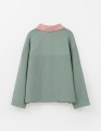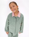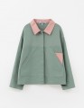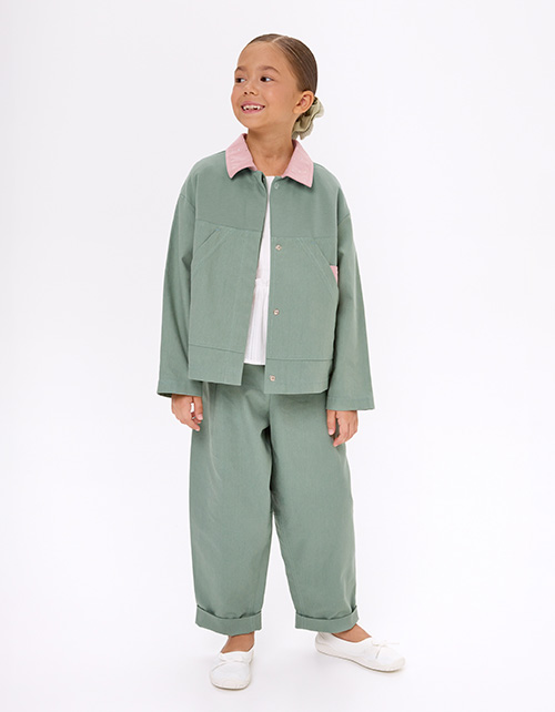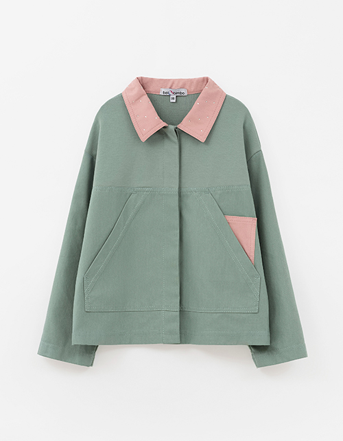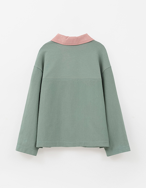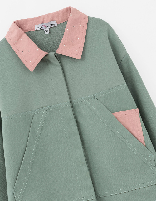 Комбинированный жакет из футера и твила в утилитарном стиле. Расслабленный прямой силуэт с приспущенной линией плеча. Контрастный воротник подчёркивает дизайн. Потайные кнопки сохраняют чистый вид. Стразы добавляют аккуратный акцент и лёгкий блеск.