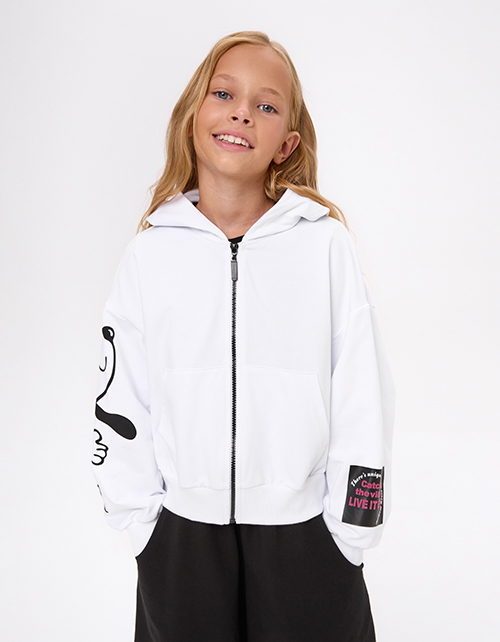 Укороченное белое зип-худи с объёмным силуэтом и приспущенной линией плеча. Глубокий капюшон с кулиркой и накладные карманы добавляют удобства. Водная шаблонная печать создаёт эффект комикса. Крафтовая лейба с бархатной плёнкой завершает дизайн.
