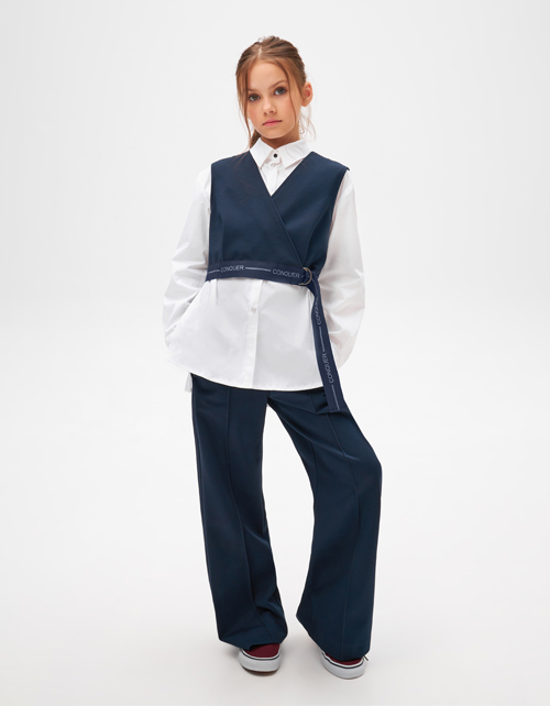 Школьная тёмно-синяя кроп-топ жилетка для девочки. Прямая модель с репсовой лентой с прорезиненной печатью. Изделие с регулировкой по ширине.
