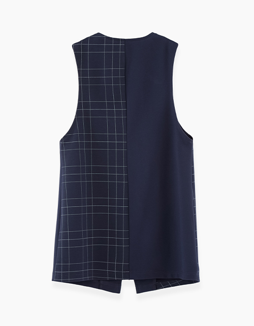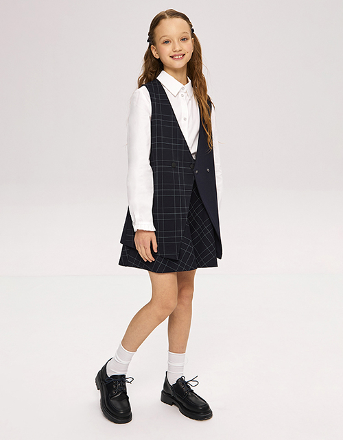 Удлиненный жилет в клетку. Комфортная повседневная школьная модель для девочки. С застежкой на кнопки. Жилет дополнен тематическим значком.
