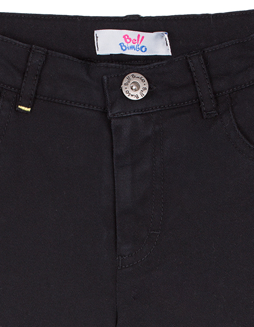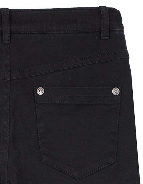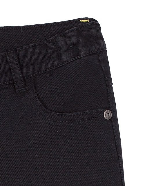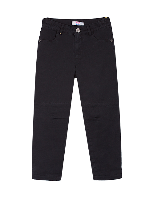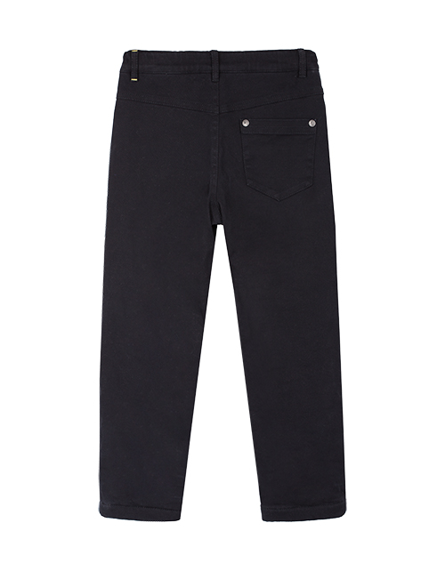 Черные брюки для мальчика выполнены в классическом стиле и имеют прямой силуэт. Изделие дополнено застежкой на молнии с пуговицей, двумя внутренними и одним накладным карманом. Брюки пошиты из твила, что гарантирует повышенный комфорт и износостойкость.