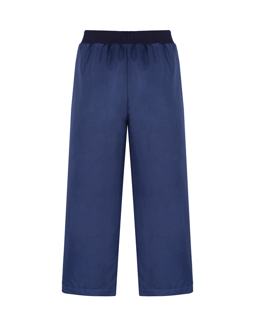 Темно-синие брюки для мальчика из плащевой ткани таслон обеспечивают влагонепроницаемость в непогоду. Изделие свободного фасона в спортивном стиле дополнено удобной резинкой на поясе. Подкладка из интерлока дарит дополнительный комфорт в носке.