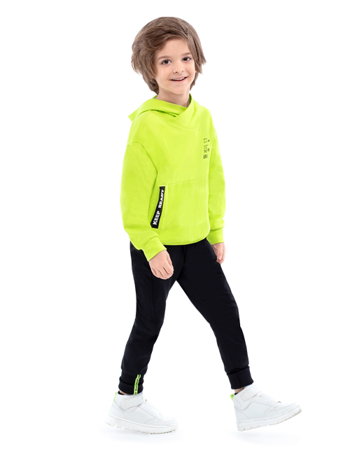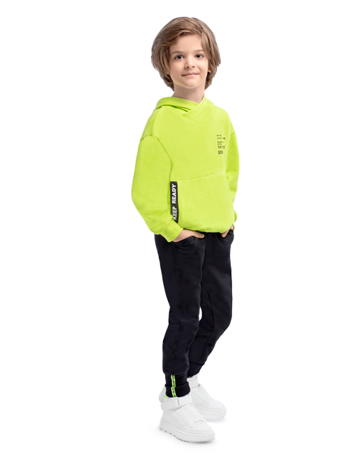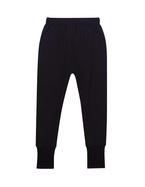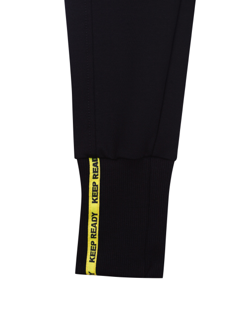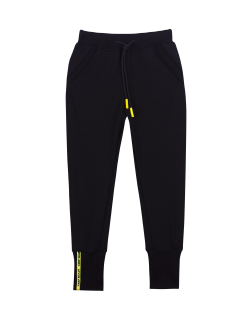 Черные брюки для мальчика. Резинка и манжеты из рибаны. Декоративный шнур с прорезиненными наконечниками флуоресцентного лимонного цвета. Оформление в стилистике капсулы "Новый мир".