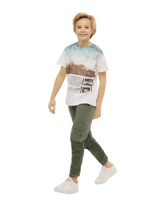 Зауженные к низу брюки для мальчика цвета хаки. Накладные карманы и притачные манжеты на резинке по низу. Принт-надпись в стилистике капсулы "Городские джунгли".