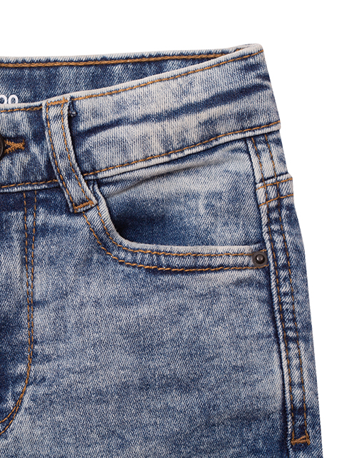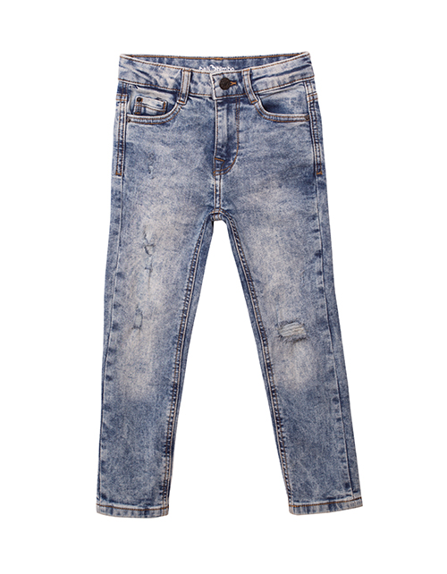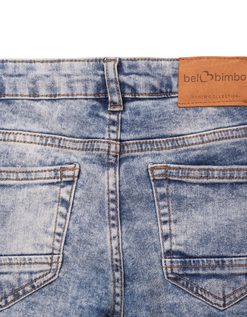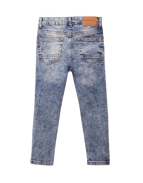 Джинсы для мальчика классического силуэта. Передние и задние накладные карманы. Шлёвки по поясу. Эффект потертости на лицевой стороне.