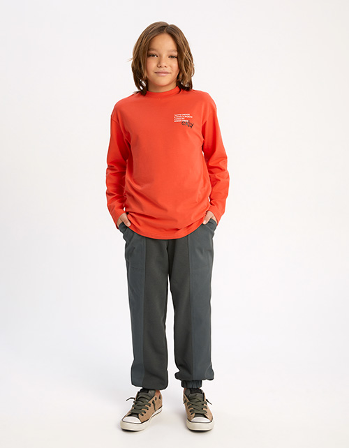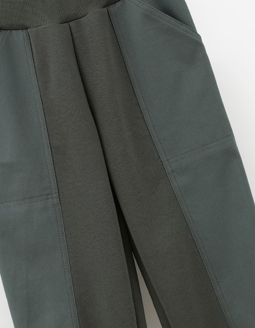 Брюки благородного серо-зелёного оттенка для мальчика. Комбинированная модель из футера и твила. Прямая модель, со средней посадкой. Изделие на мягком поясе. Эластичные манжеты на ленте. Брюки дополнены боковыми карманами.