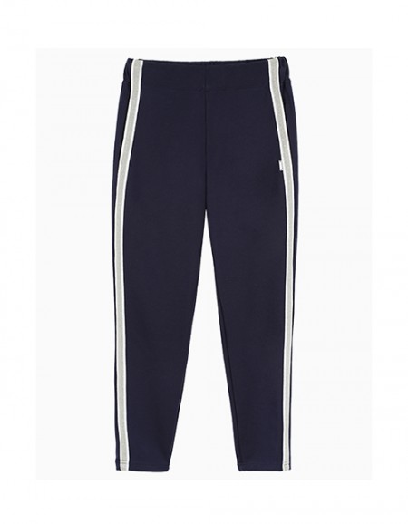 Брюки-джоггеры из темно-синего футера с функциональными карманами. Боковые швы смещены вперед. Декоративные акценты в виде стежков-закрепок контрастного цвета на карманах и тесьме. Манжеты и пояс из рибаны