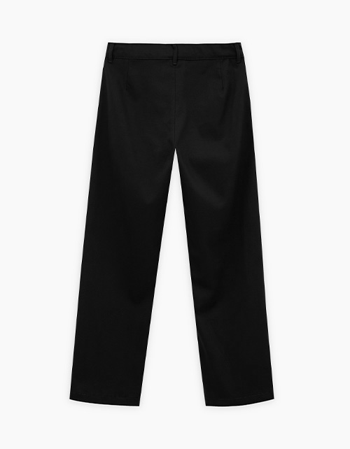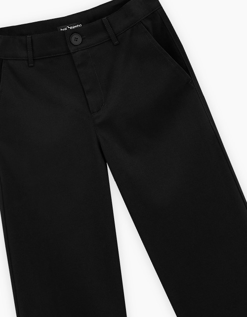 Чёрные брюки из твила. Модель прямого силуэта и средней посадкой. Пояс с внутренней регулировкой. Есть шлёвки для ремня. Застёжка на молнию и пуговицу. Внутри карманы из 100% хлопка. Для улучшения характеристик, твил прошёл дополнительную обработку.