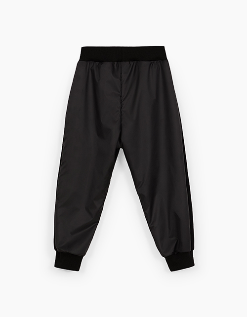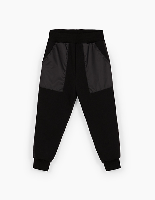 Чёрные брюки-джоггеры для мальчика. Прямая модель со средней посадкой. Изделие без застёжки, на мягком поясе. Манжеты из рибаны. Брюки из футера с накладными карманами из плащевой ткани. Сзади плащевая ткань - комфорт и удобство в прохладную погоду.