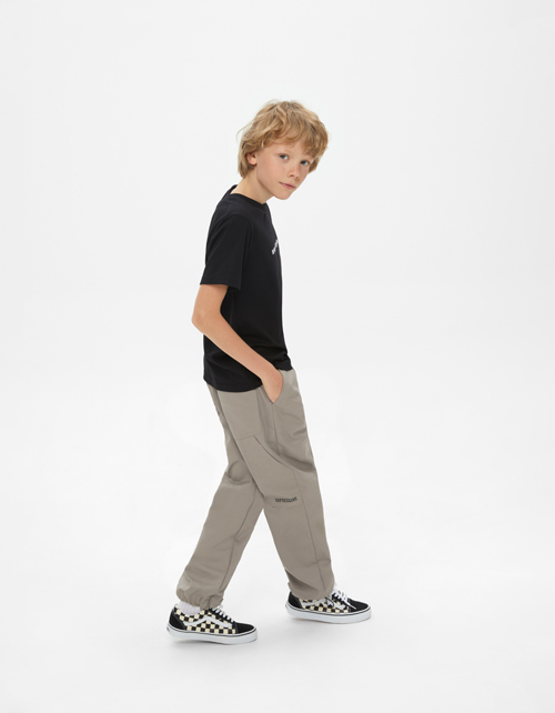 Серо-коричневые брюки для мальчика. Прямая модель со средней посадкой. Изделие снизу на кулисах с регулировкой, за счёт чего можно создавать разные образы. Максимально комфортные брюки из твила.
