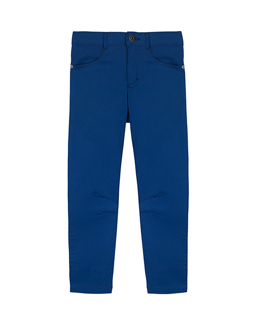 Брюки-джоггеры из синего твила с манжетами на резинке для активного мальчика. Пояс, собранный на эластичную ленту, обеспечивает комфортную посадку. Два прорезных кармана и накладные карманы с клапанами делают модель функциональной и стильной.