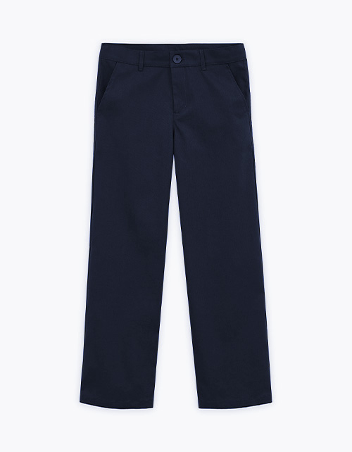 Тёмно-синие брюки из твила. Модель прямого силуэта и средней посадкой. Пояс с внутренней регулировкой. Есть шлёвки для ремня. Застёжка на молнию и пуговицу. Внутри карманы из 100% хлопка. Для улучшения характеристик, твил прошёл дополнительную обработку.