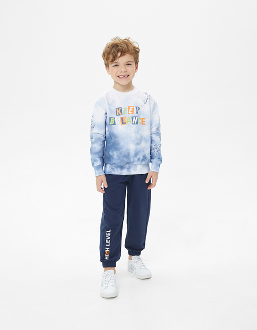 Тёмно-синие брюки-джоггеры для мальчика. Комфортная базовая модель прямого кроя на мягком поясе. Брюки из футера снизу на рибане. Джоггеры со средней посадкой декорированы надписью.