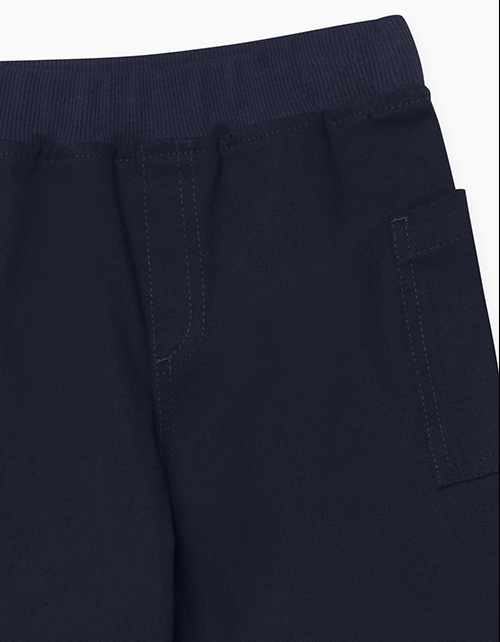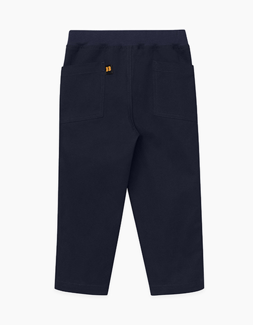 Темно-синие брюки на мягком поясе для мальчика. Смещенные назад боковые карманы, отстрочка, имитирующая гульфик, и яркое лого на вшивке из тесьмы делают функциональную модель стильной.