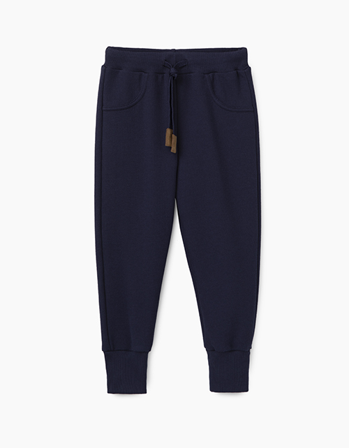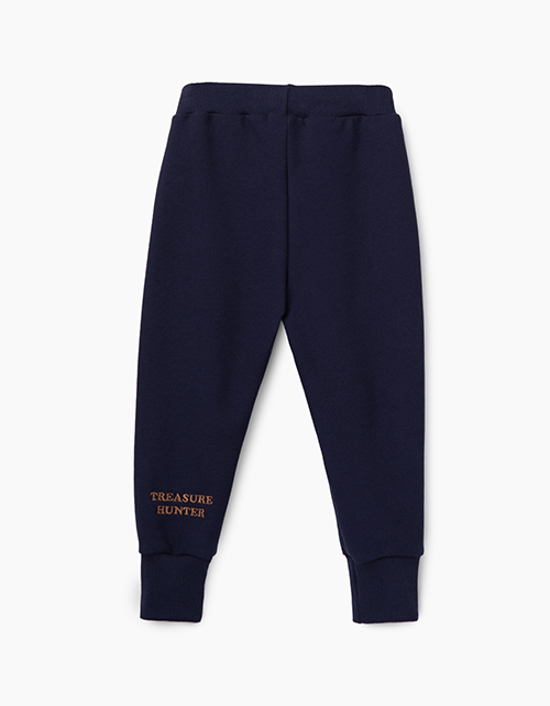Трикотажные зауженные брюки с начесом. Темно-синего цвета. Пояс и удлиненные манжеты из рибаны. Вышивка Treasure Hunter ("Кладоискатель") слева сзади. Тесьма в поясе с наконечниками в тон вышивке. Имитация карманов