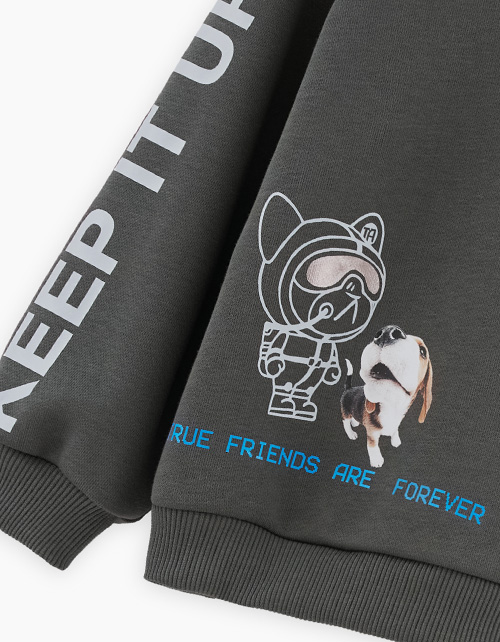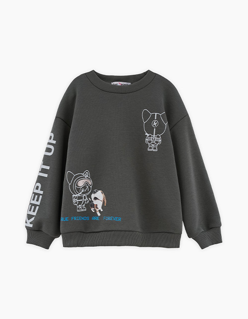 Базовый свитшот глубокого оттенка тёмный лес для мальчика. Модель прямого объёмного силуэта. Приспущенная линия плеча. Воротник, манжеты и низ изделия из рибаны. Свитшот декорирован авторскими принтами, с использованием DTF печати.