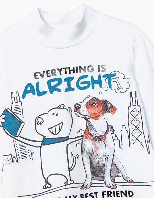Белый лонгслив с высоким воротником-стойкой. Стильная модель для мальчика спереди украшена принтом с собачками и надписью Everything is alright with my best friend ("Все хорошо, когда я со своим лучшим другом").