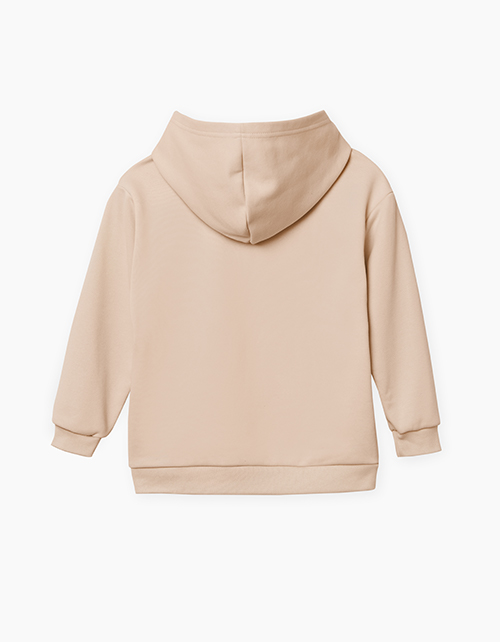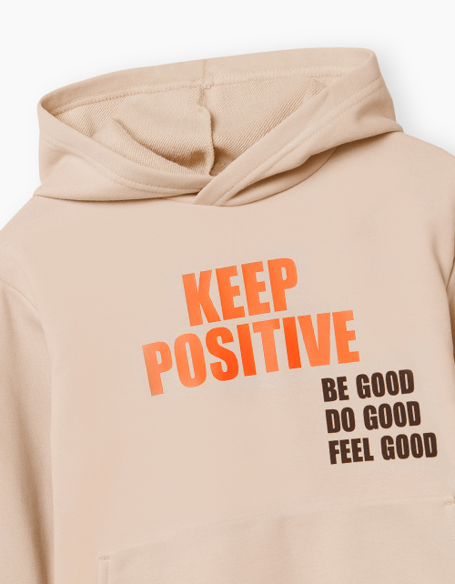Бежевое худи объемного силуэта со спущенной линией плеча, нахлестом на капюшоне и сквозным накладным карманом спереди. Выполнено из плотного футера. Низ и манжеты отделаны рибаной в тон. Декорировано контрастными позитивными слоганами в тематике капсулы.