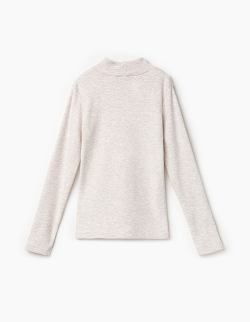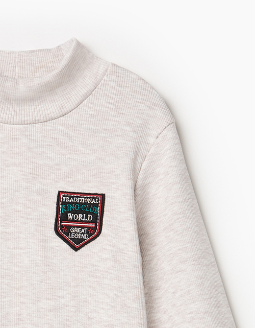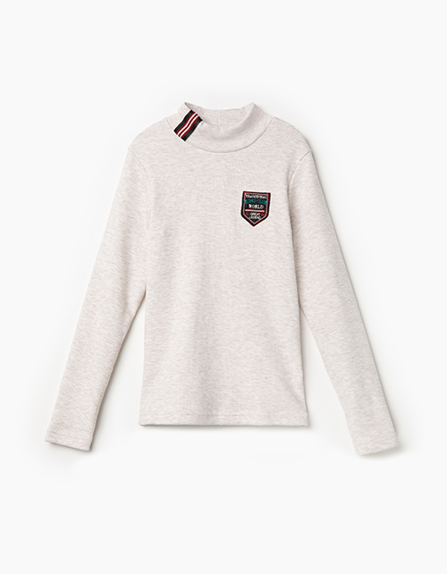 Джемпер приталенного силуэта с воротником-стойкой для мальчика. Выполнен из меланжевого кашкорсе бежевого цвета с начесом. Модель декорирована шевроном темно-синего цвета и контрастной тесьмой на горловине.