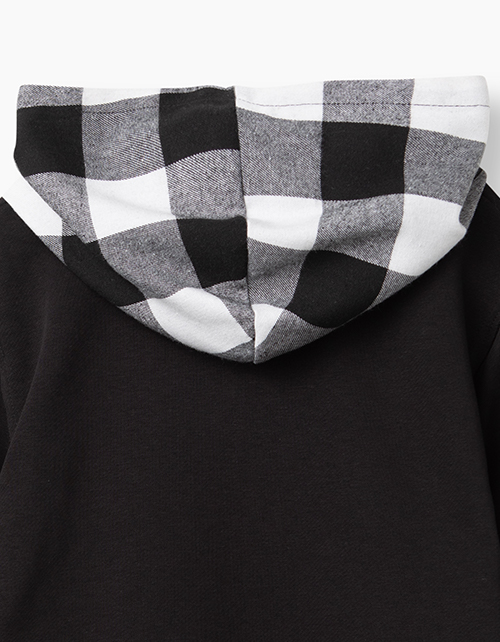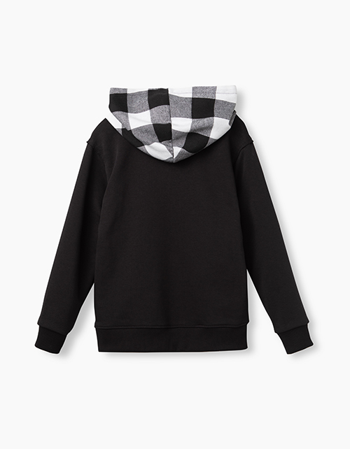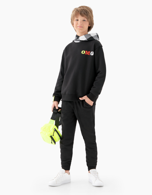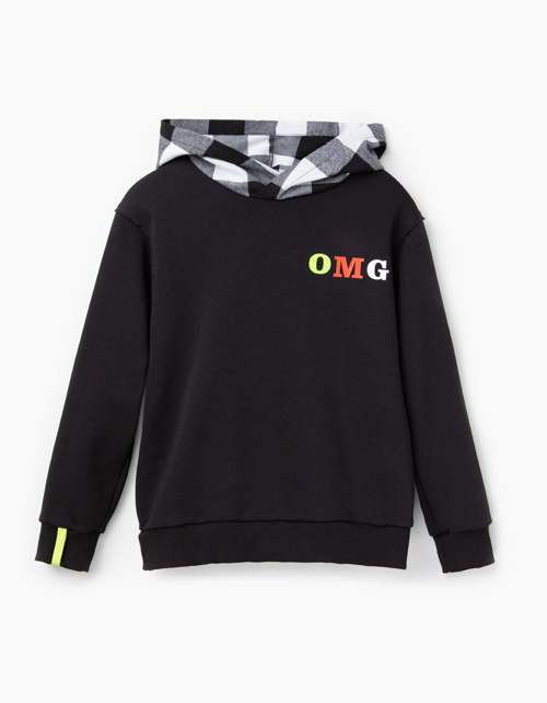 Худи с длинным рукавом для мальчика-подростка. Модель выполнена из черного футера. С капюшоном из сорочечной фланели в клетку. Манжеты и низ - из рибаны. Яркий принт OMG (аббревиатура "О, мой бог") на груди слева.