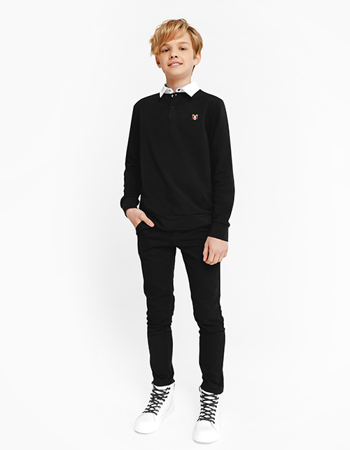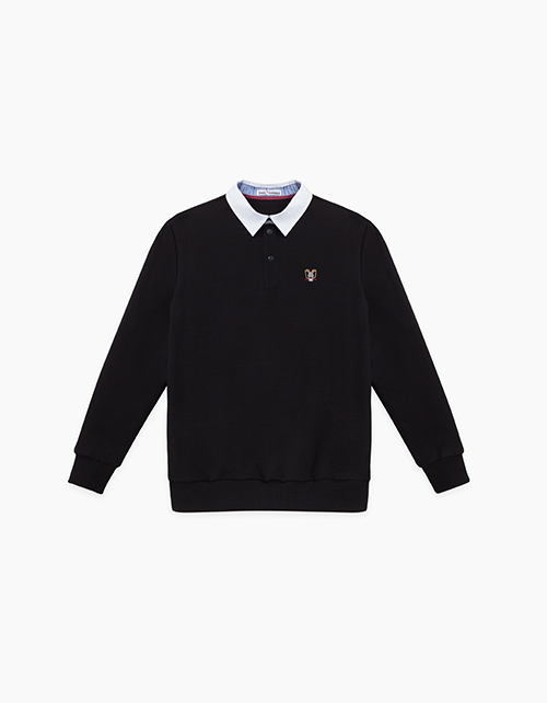 Джемпер поло прямого силуэта, с длинным рукавом. Выполнен из черного футера. Воротник - из белой сорочечной ткани, с отделкой из ткани в полоску и контрастной тесьмой по внутренней стороне. Декорирован фирменной эмблемой в виде совы, стрелы и книги