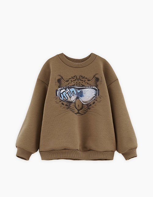 Дизайнерский свитшот оттенка молоко для мальчика. Модель прямого объёмного силуэта. Приспущенная линия плеча. Воротник и манжеты из эластичной рибаны. Почерковая модель бренда декорирована авторскими принтами.