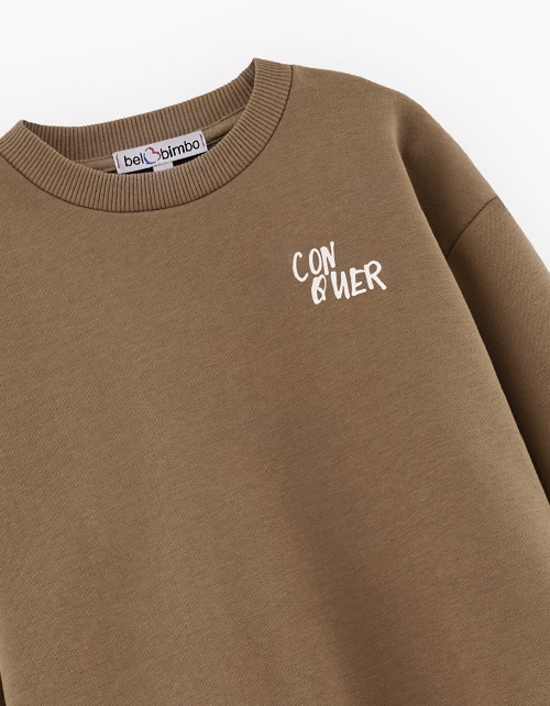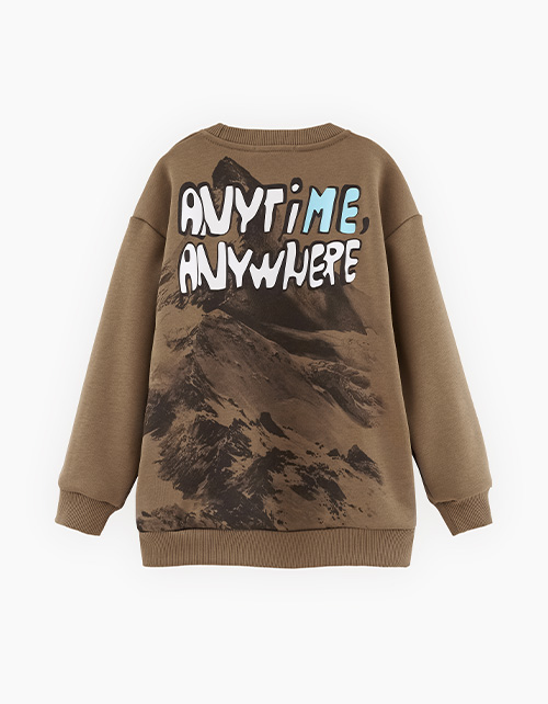 Дизайнерский свитшот тёплого оттенка карамельный песок для мальчика. Модель прямого объёмного силуэта. Спущенная линия плеча. Воротник, манжеты и низ изделия из рибаны. Свитшот с акцентной спинкой декорирован авторскими принтами.