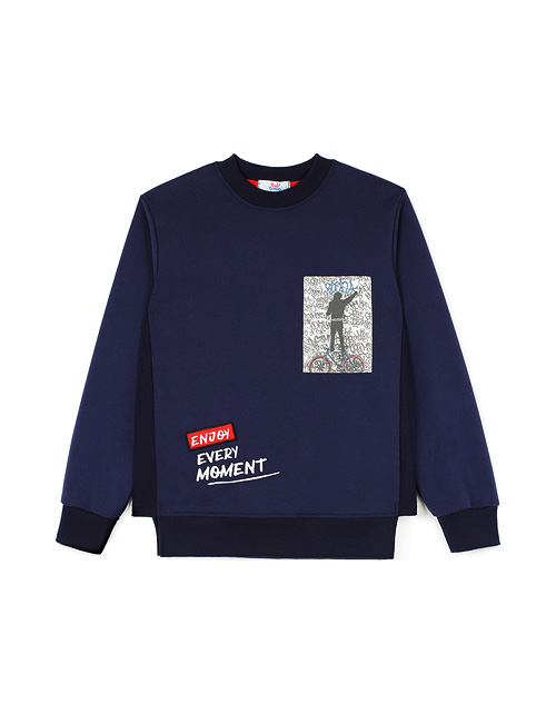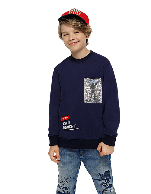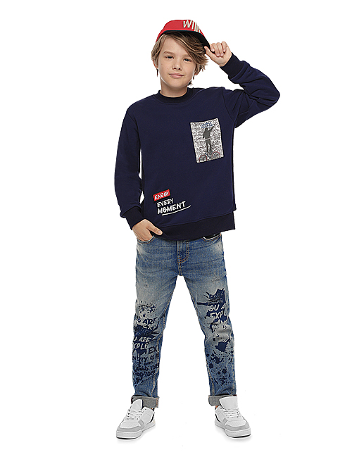 Джемпер для мальчика свободного силуэта дополнен круглым вырезом горловины, манжетами на рукавах и по низу изделия, стильными принтами и вставками по бокам. Изделие пошито из футера, обеспечивающего износостойкость и приятные тактильные ощущения.