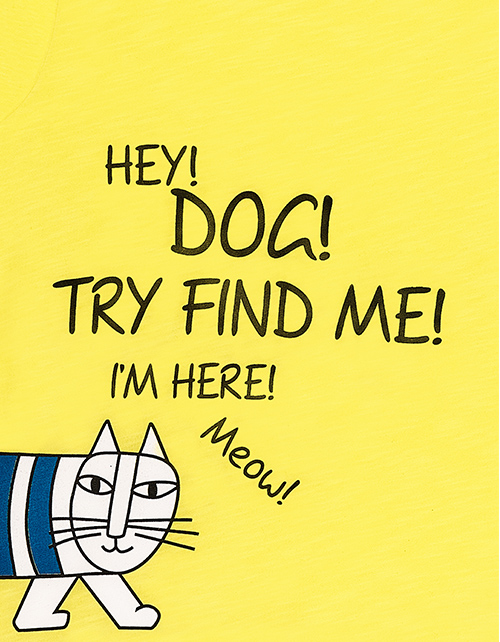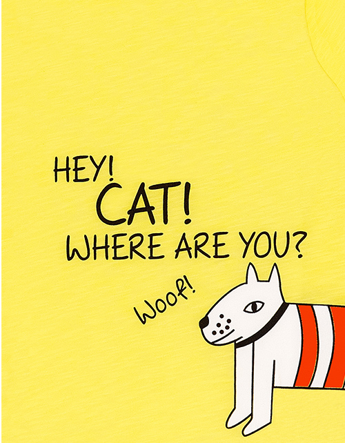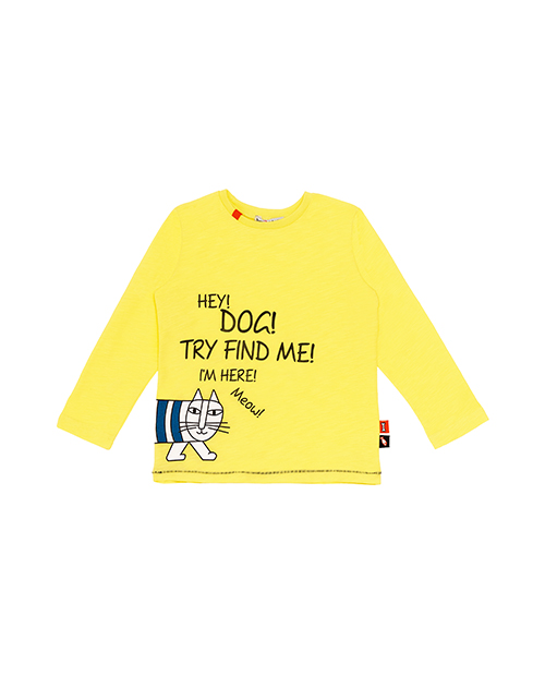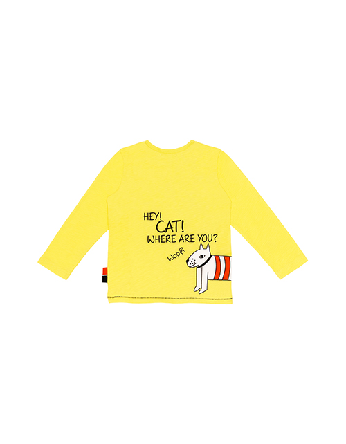 Желтый джемпер для мальчика с круглым вырезом горловины. Дизайнерской оформление лицевой стороны и спинки в стилистике капсулы "Кото-пес", нашивки.