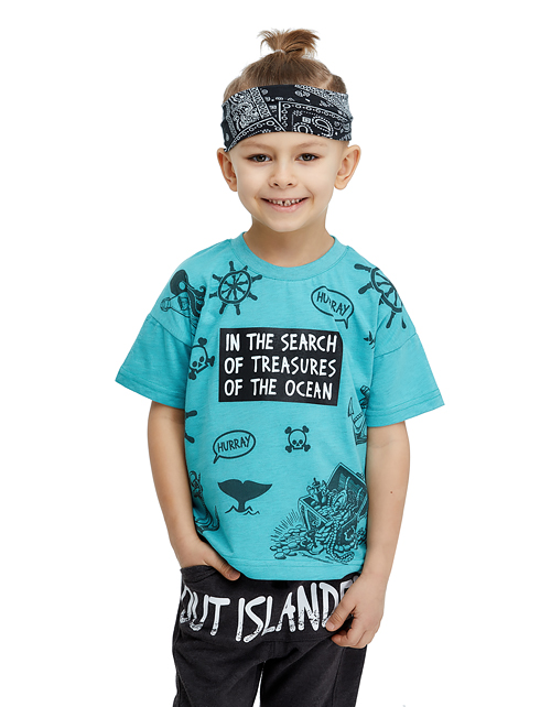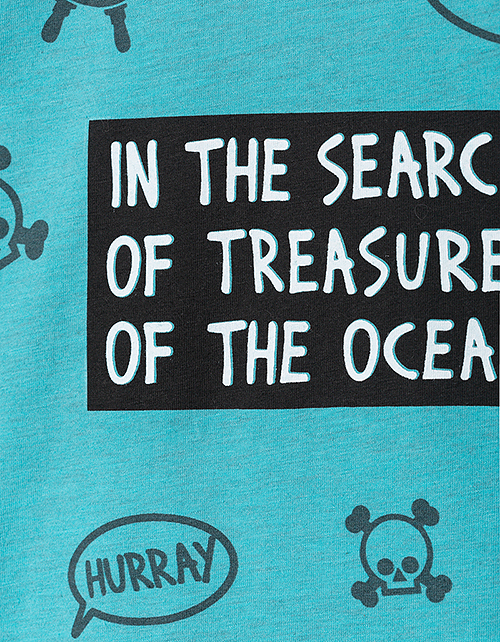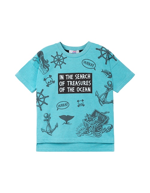 Невероятно стильная футболка с принтом на любимую всеми мальчишками тему пиратов. "Морской" принт с изображением сокровищ, якоря, штурвала и яркая надпись помогут ребенку почувствовать себя настоящим покорителем морских просторов