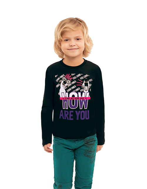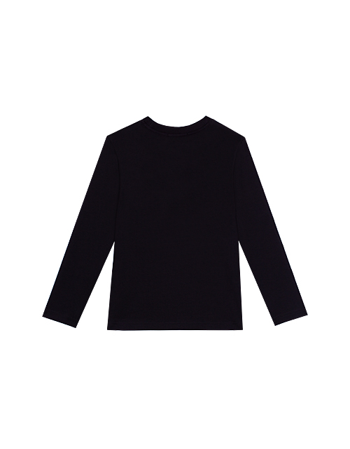 Черный лонгслив для мальчика прямого силуэта. Круглый вырез горловины. Принт на лицевой стороне в стилистике капсулы "Дружище Бакс".