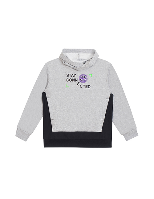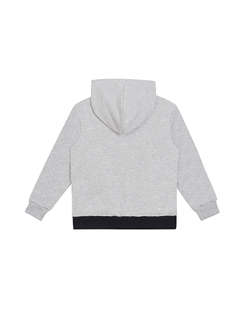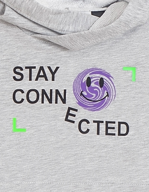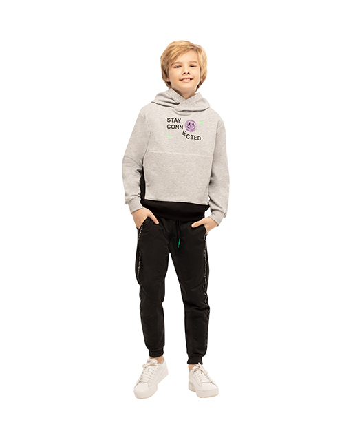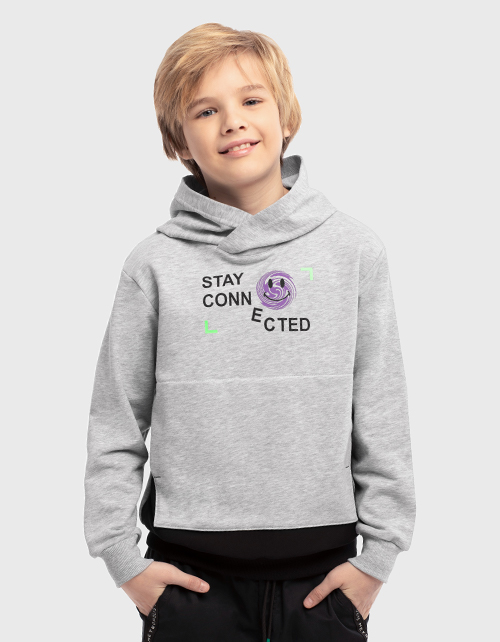 Худи для мальчика цвета серый меланж. Манжеты и низ изделия из рибаны. Вставка из черного футера. Принт в стилистике капсулы "Мегаполис".