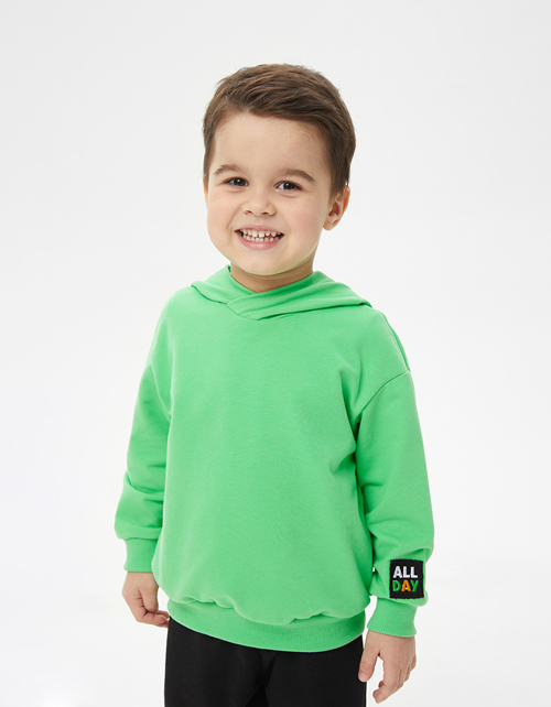 Худи летнего зеленого оттенка для мальчика. Стильная модель со спущенной линией плеча декорирована вышивкой с аппликацией. Джемпер выполнен из футера с браш-эффектом, что делает его мягким и бархатистым, повышая износостойкость.