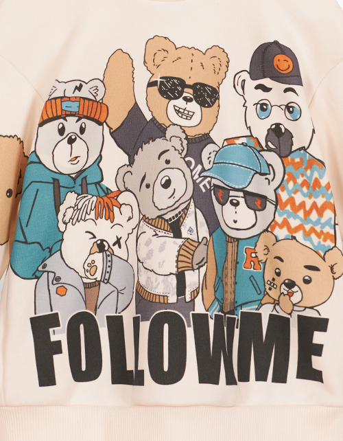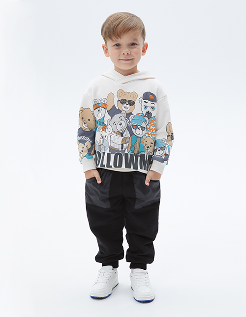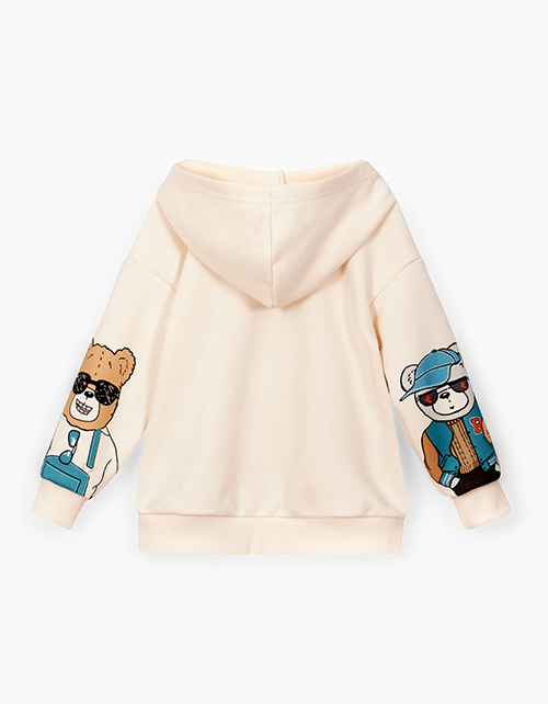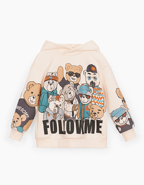 Светлое худи с капюшоном для мальчика. Модель прямого объёмного силуэта со спущенной линией плеча. Низ изделия из рибаны. Перед и рукава худи декорированы дизайнерскими принтами.