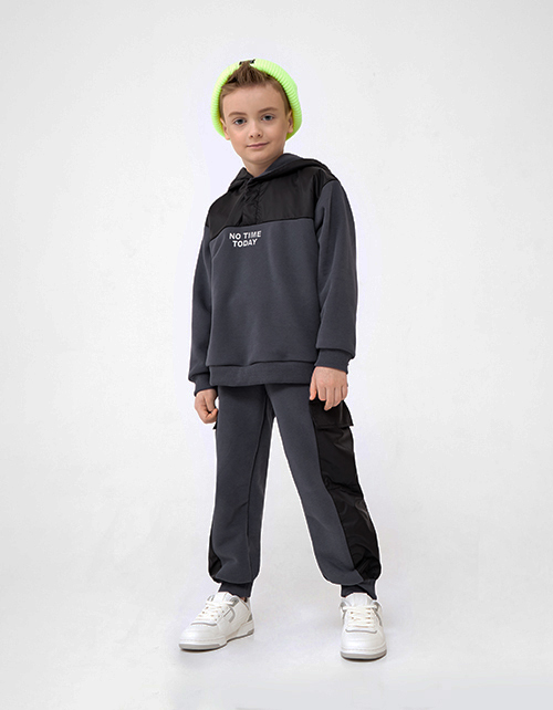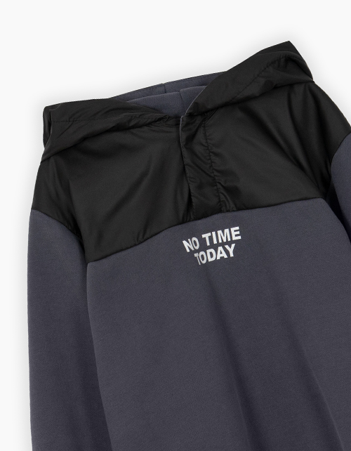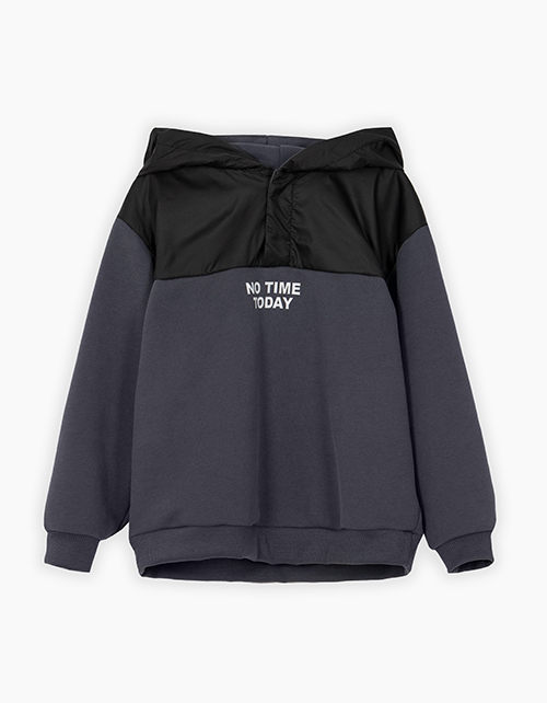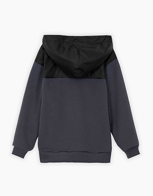 Худи стильного графитового оттенка для мальчика. Модель с капюшоном, прямого силуэта, со спущенной линией плеча. Низ и манжеты из рибаны. Худи выполнено из тактильно приятного футера в комбинации с плащевой тканью. Шрифтовой декор.