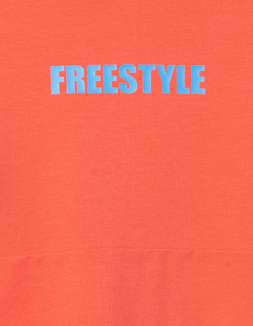 Худи свободного силуэта для мальчика. Выполнено из футера модного кораллового цвета. Стильные акценты: капюшон с нахлестом и карман-кенгуру с контрастной нашивкой