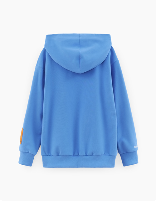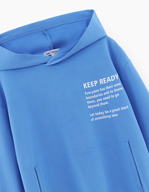Лазурное худи для мальчика. Прямая модель со спущенной линией плеча. Изделие из футера с браш-эффектом декорировано дизайнерской нашивкой-лэйбой.