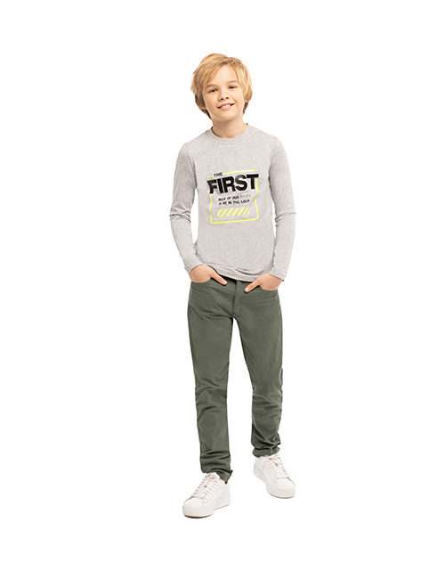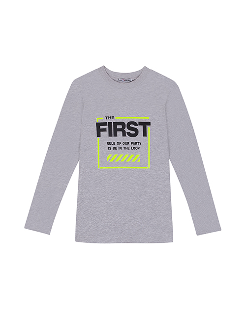 Лонгслив для мальчика цвета серый меланж. Круглый вырез горловины. Дизайнерское оформление в стилистике капсулы "Уличный движ".