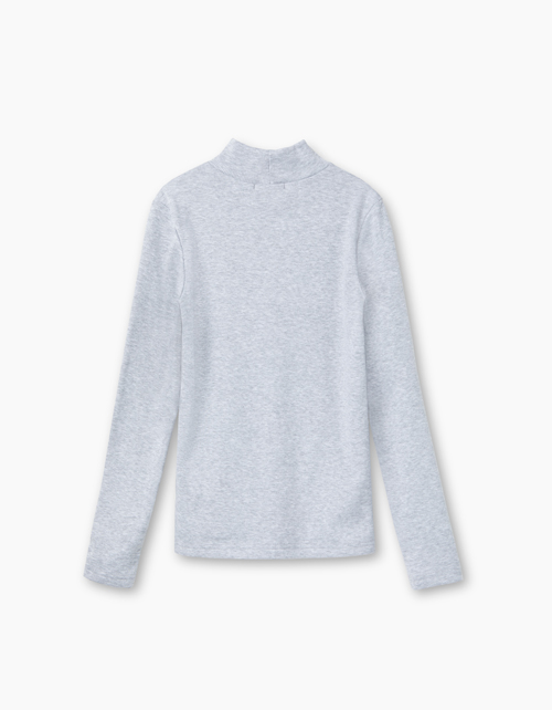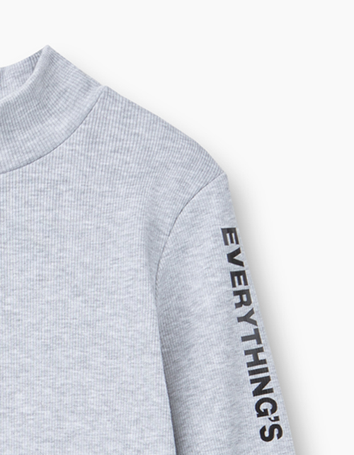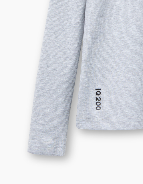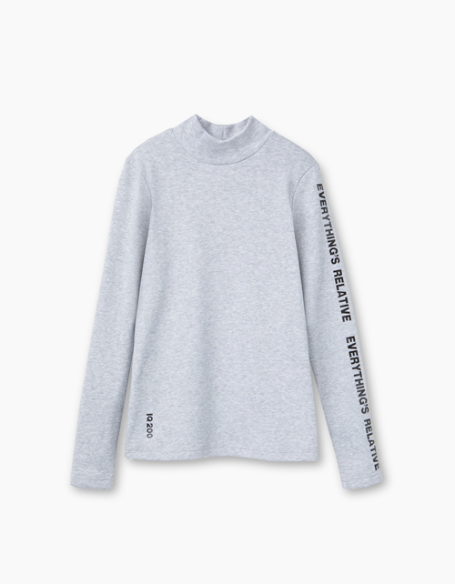 Светло-серый школьный джемпер прилегающего силуэта с втачным рукавом и горловиной-стойкой, выполнен из трикотажного полотна кашкорсе с начёсом. Отделка по рукаву в виде надписи "Everything's relative" и надпись снизу джемпера "IQ200".