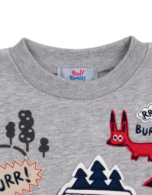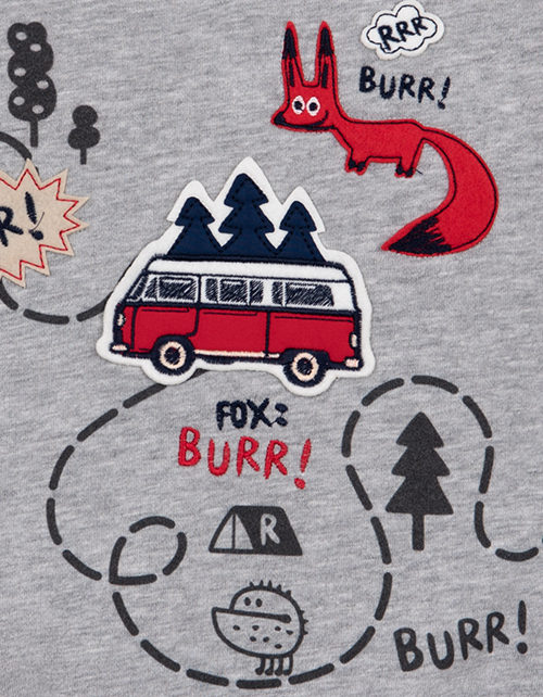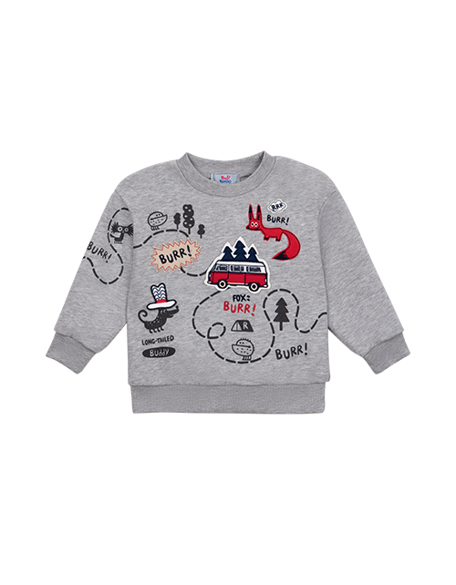 Джемпер для мальчика свободного фасона с длинным рукавом дополнен стильным принтом с лесной дорогой, лисичкой и автобусом. Изделие имеет круглый вырез горловины и удобные манжеты на рукавах. Ткать твил износостойкая и приятная к телу.