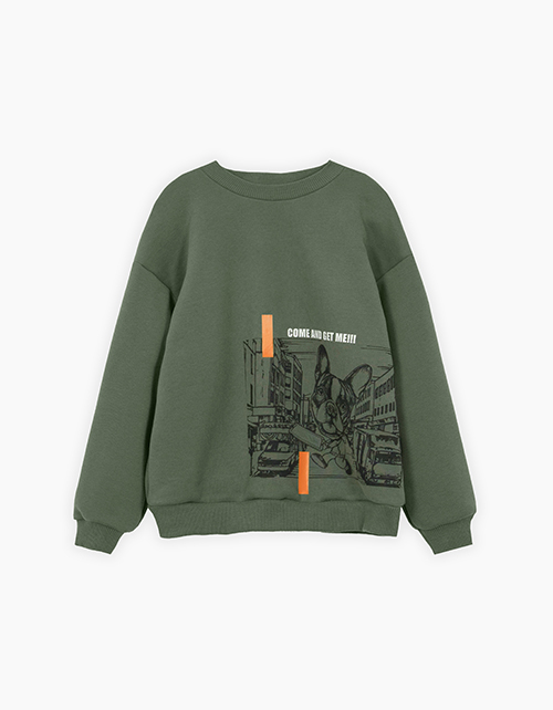 Комфортный свитшот для мальчика. Модель прямого силуэта со спущенной линией плеча. Низ и манжеты из рибаны. Свитшот выполнен из тактильно приятного футера с браш-эффектом. Модель декорирована стильным авторским принтом.