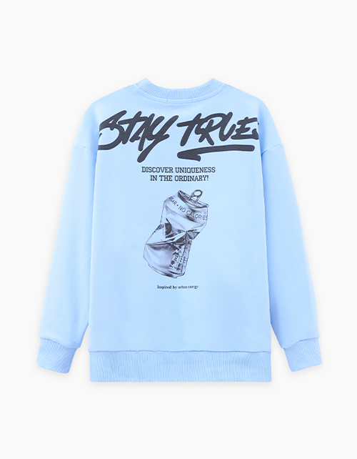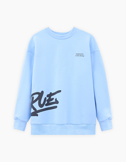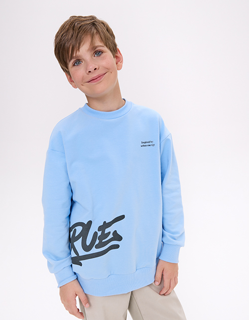 Светло-голубой свитшот из футера с браш-эффектом. Прямой силуэт с объёмом по низу на рибане создаёт современный вид. Эластичная горловина и длинный рукав обеспечивают удобную посадку. Цифровой принт с термоплёнкой подчёркивает чёткость деталей.