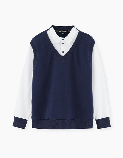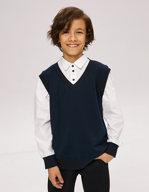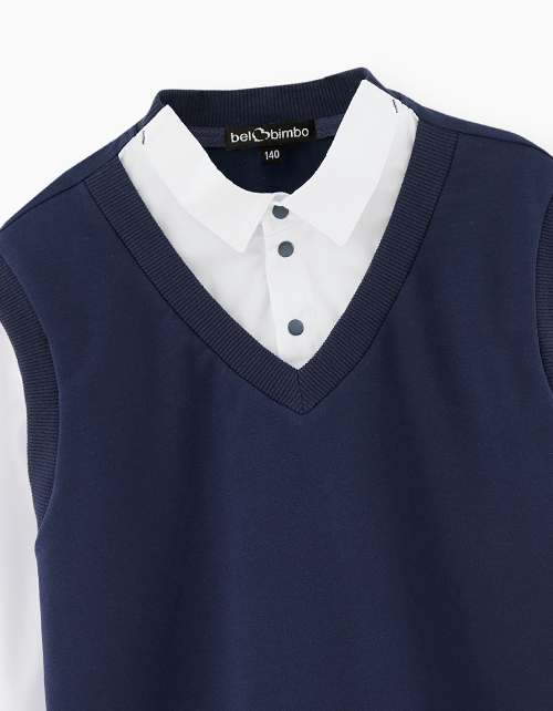 Темно-синий джемпер-обмака для мальчика. Трендовая школьная модель. Имитация белой сорочки. Удобная застежка на кнопки.