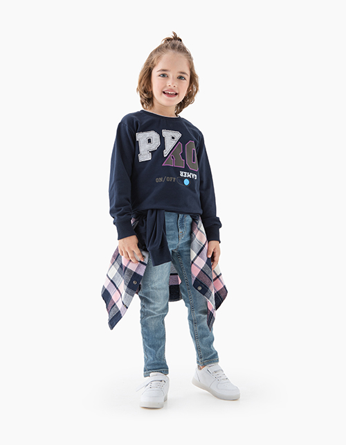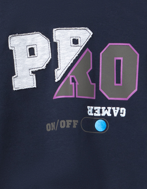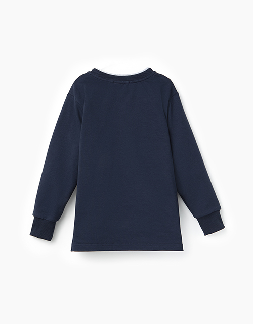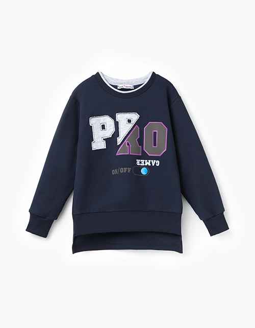 Трикотажный джемпер прямого силуэта с удлиненной спинкой для мальчика. Основная ткань - двухниточный футер темно-синего цвета. Рукава, горловина и низ спереди отделаны рибаной. Перед декорирован вышивкой и принтом