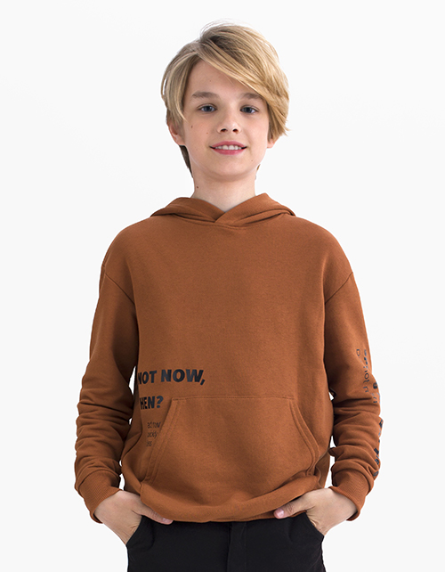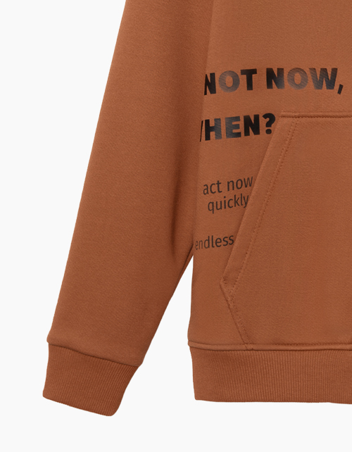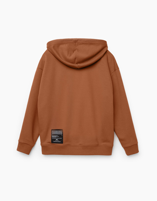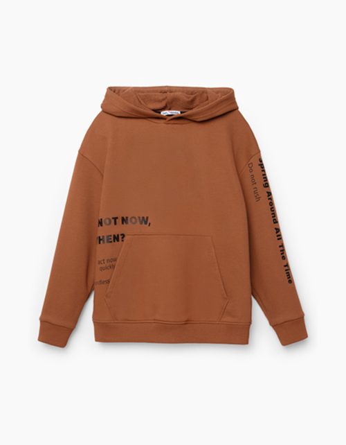 Худи расслабленного кроя со спущенной линией плеча. Выполнено из футера модного цвета. Манжеты и низ изделия отделаны рибаной. Регулируемый капюшон на контрастной тесьме. Декорировано текстовым принтом спереди и на рукаве, оригинальной нашивкой сзади.