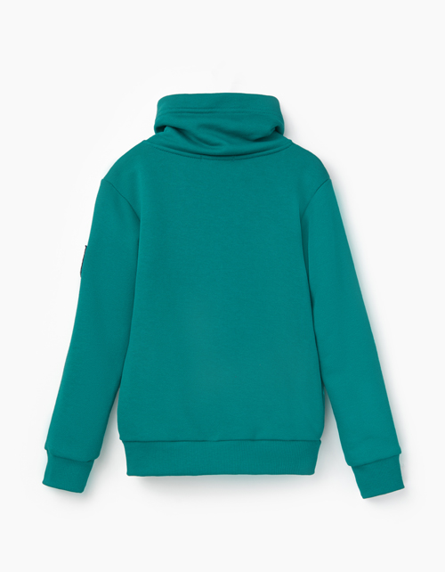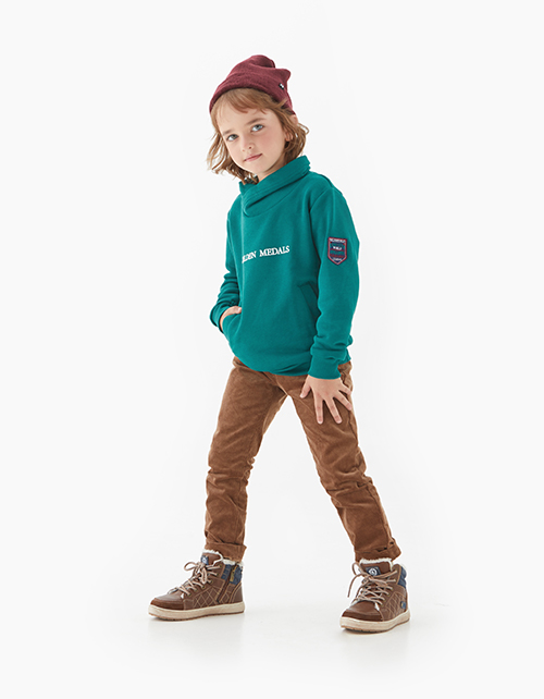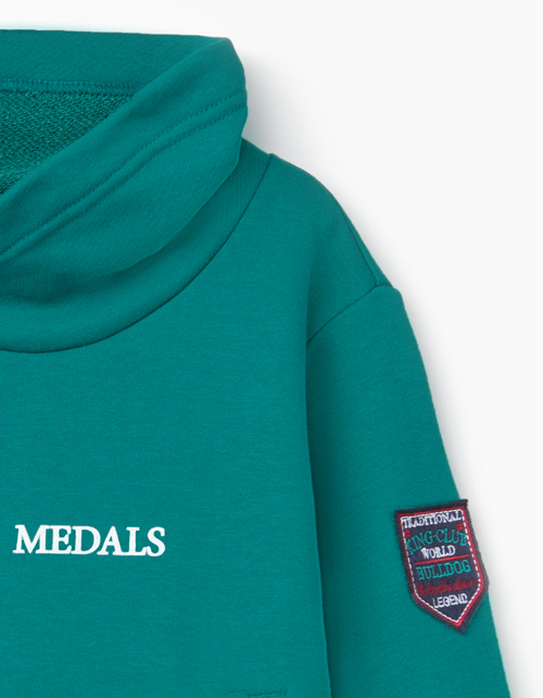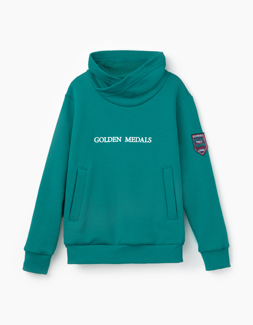 Трикотажный джемпер для мальчика. Свободного силуэта, с умеренно спущенным плечом и запахивающимся воротником-стойкой. Джемпер декорирован шрифтовым принтом Golden medals ("Золотые медали") спереди и нашивкой на рукаве.