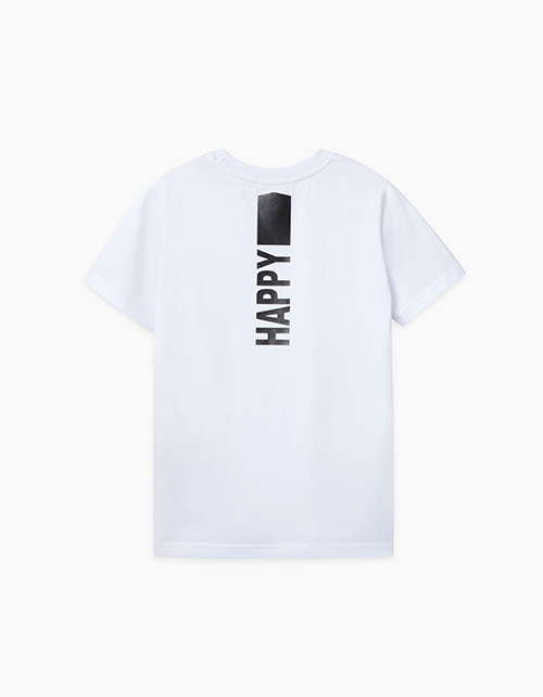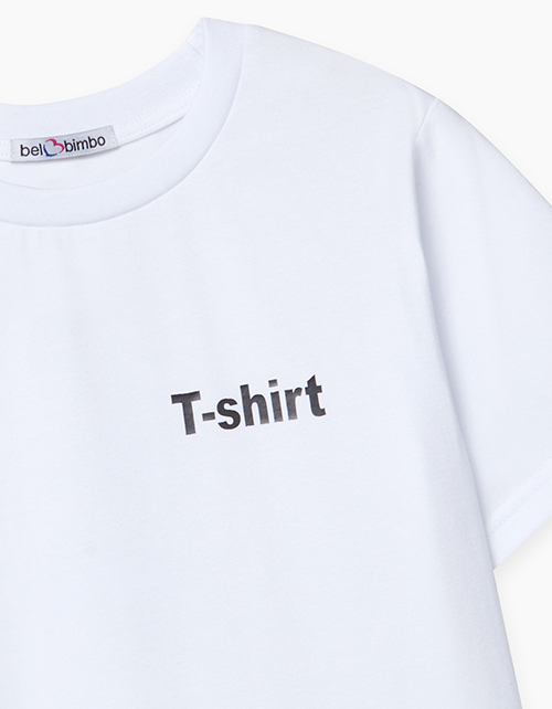 Базовая белая футболка из кулирной глади для мальчика-подростка. Прямого силуэта, с круглой горловиной из рибаны в тон. Декорирована контрастным текстово-графическим принтом на спине и надписью T-shirt на груди слева