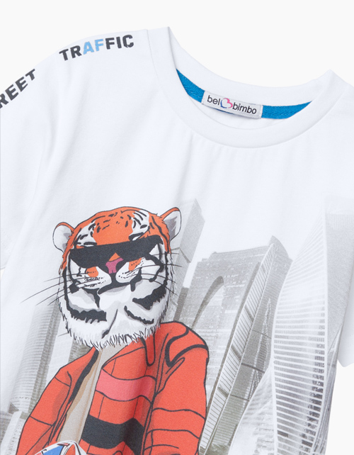 Белая футболка свободного силуэта для мальчика. Выполнена из белой кулирной глади. Декорирована фотоколлажем с изображением яркого персонажа на фоне монохромного урбанистического пейзажа. На левом плече - надпись Street traffic ("Уличное движение")