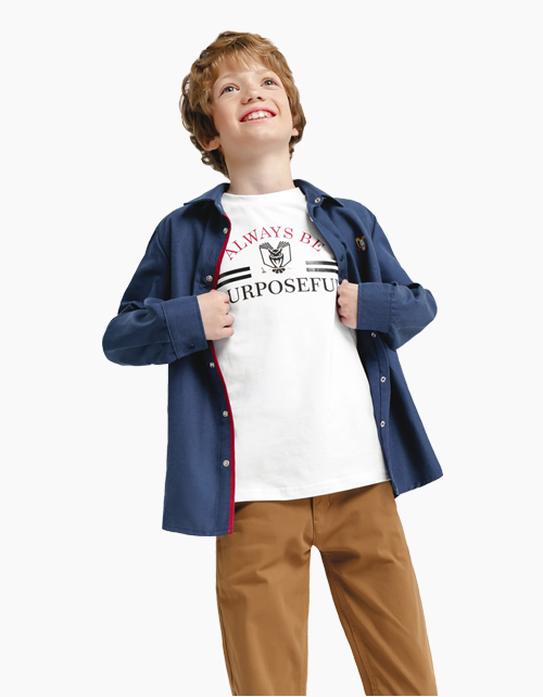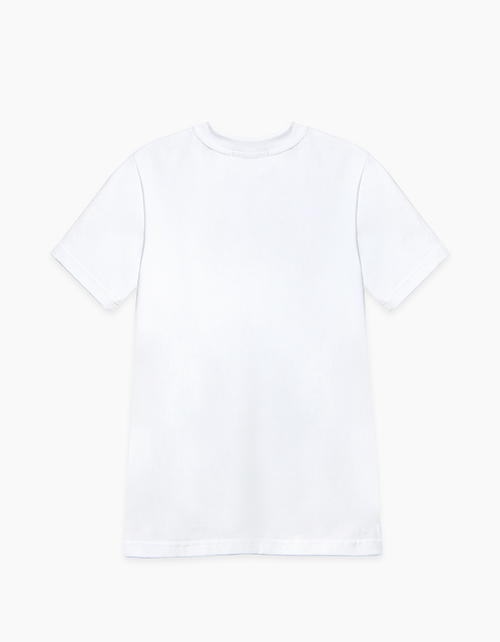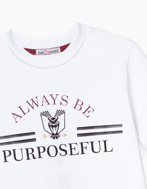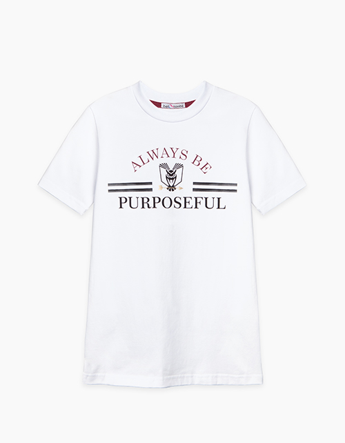 Классическая белая футболка с круглой горловиной для мальчика. Выполнена из кулирной глади с эластаном. Декорирована контрастным изображением фирменной эмблемы с изображением совы и надписью Always be purposeful ("Всегда будь целеустремленным")
