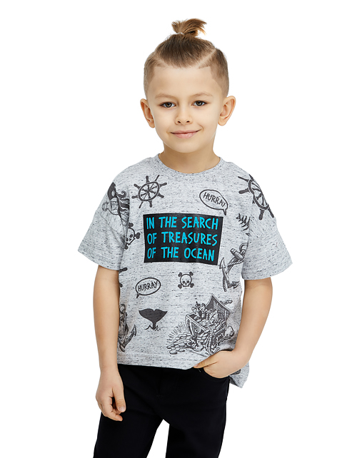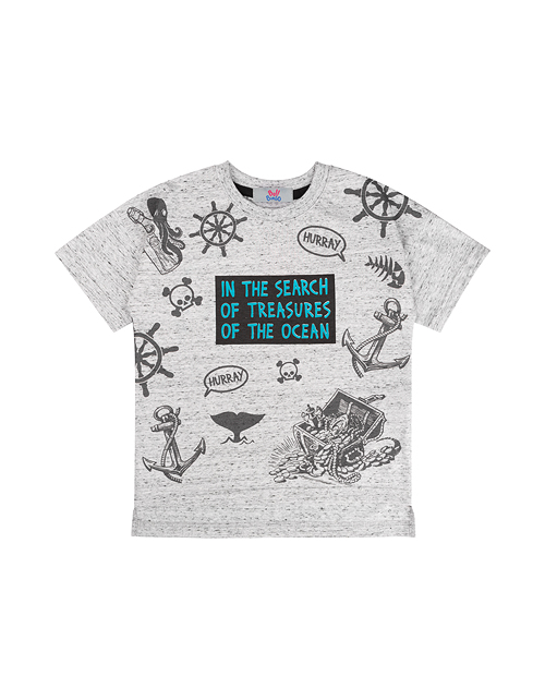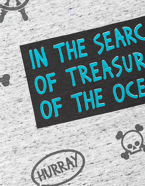 Невероятно стильная футболка с принтом на любимую всеми мальчишками тему пиратов. "Морской" принт с изображением сокровищ, якоря, штурвала и яркая надпись помогут ребенку почувствовать себя настоящим покорителем морских просторов